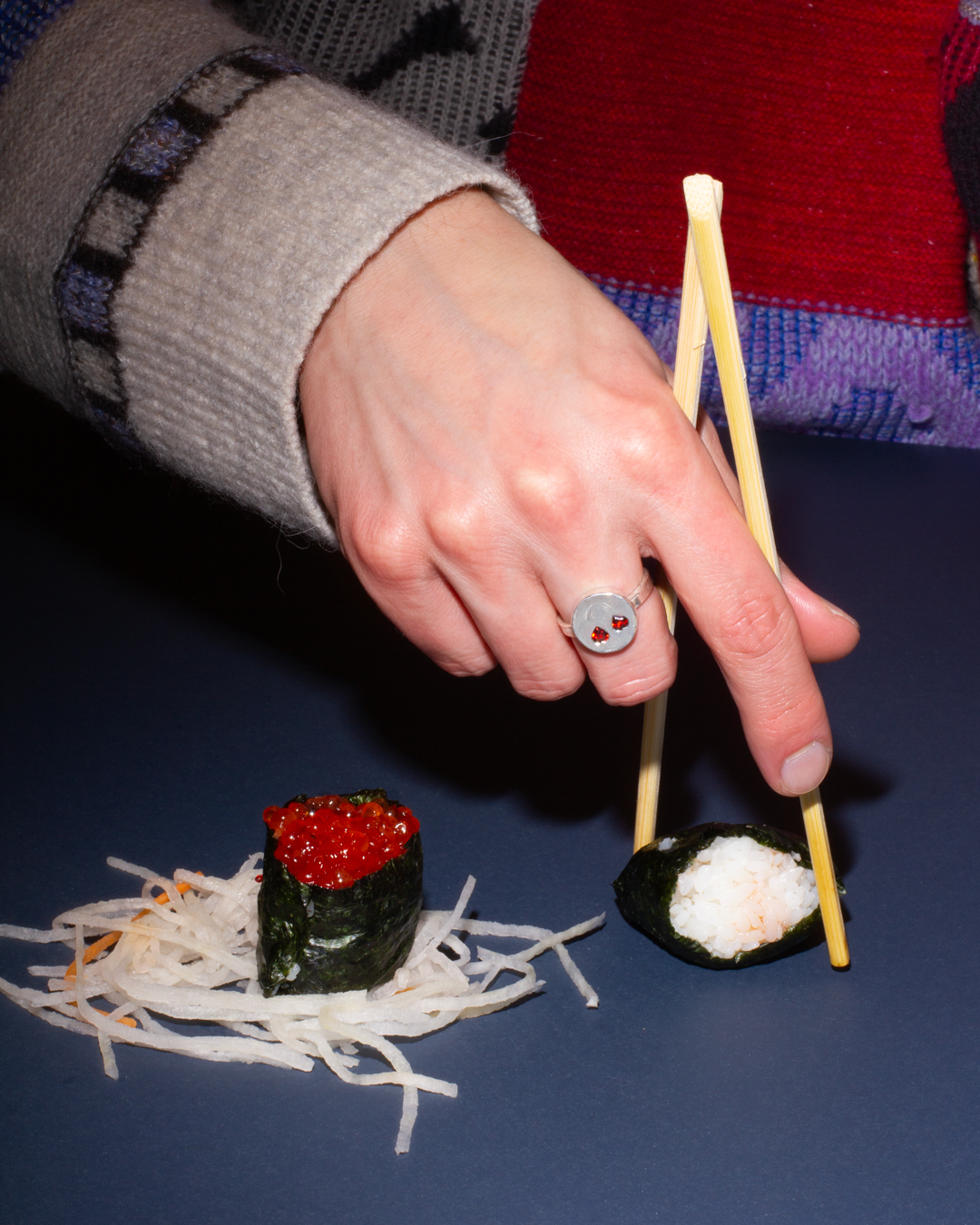 Die Ringe von bliss & gloom verkörpern den Geist der Zeit. Zum einen spiegeln sie das digitale Zeitalter wider, in dem es möglich ist, ganze Gespräche lediglich mit Emojis zu führen. Zum anderen sind diese Ringe eine Neuinterpretation traditioneller Talismane. Schmuck begleitet die Menschheit seit ihren Anfängen, und ebenso lange existieren Talismane, die das Bedürfnis nach Schutz und Sicherheit symbolisieren. Ein solcher Talisman dient als treuer Begleiter in schwierigen Momenten, auf den man sich besinnen kann und der Halt bietet. Gerade jetzt, wo das Thema mentale Gesundheit immer mehr in die Mitte der Gesellschaft rückt, kann Schmuck ein wichtiges Bedürfnis erfüllen. Die Ringe sind nicht nur schmückende Objekte, sondern auch kraftvolle Symbole für Unterstützung, Mut und Selbstliebe. Mit ihrer Vielfältigkeit an Emotionen sprechen die Ringe eine Einladung aus: Lass dich auf deine Gefühle ein, leb dein Leben, genieß auch mal die Traurigkeit und glaub daran, dass es besser wird. Jeder Ring ist auf Grund der Herstellungsweise einzigartig. In Wachs modelliert und in Silber gegossen, strahlen die Ringe trotz ihrer Imperfektion Hochwertigkeit aus. Manche Ringe sind zusätzlich mit Edelsteinen wie Diamant, Saphir oder Granat besetzt.