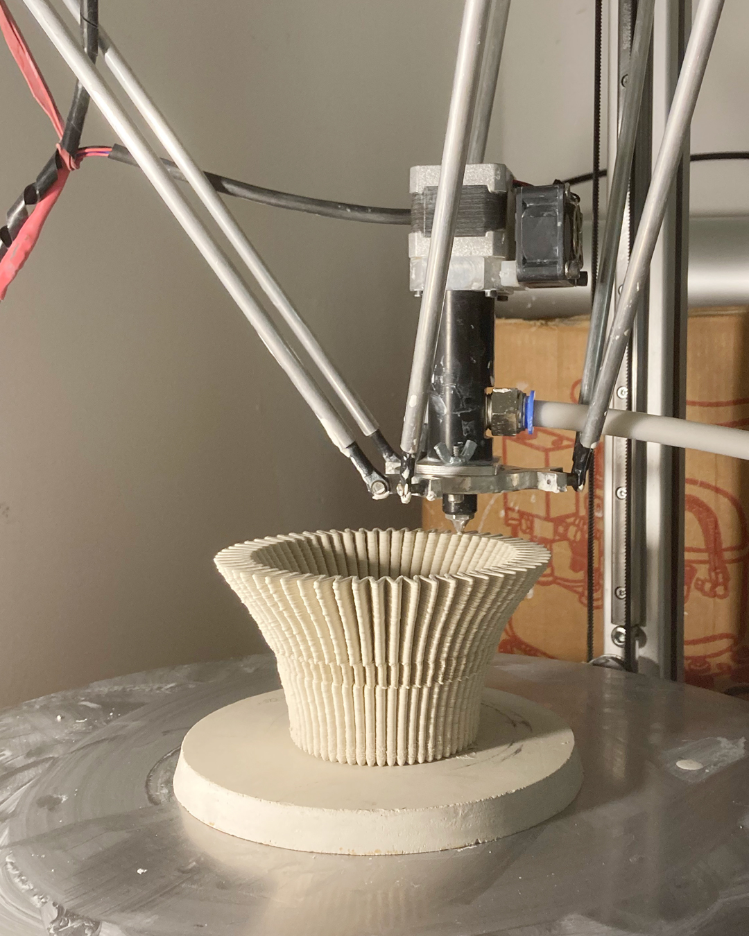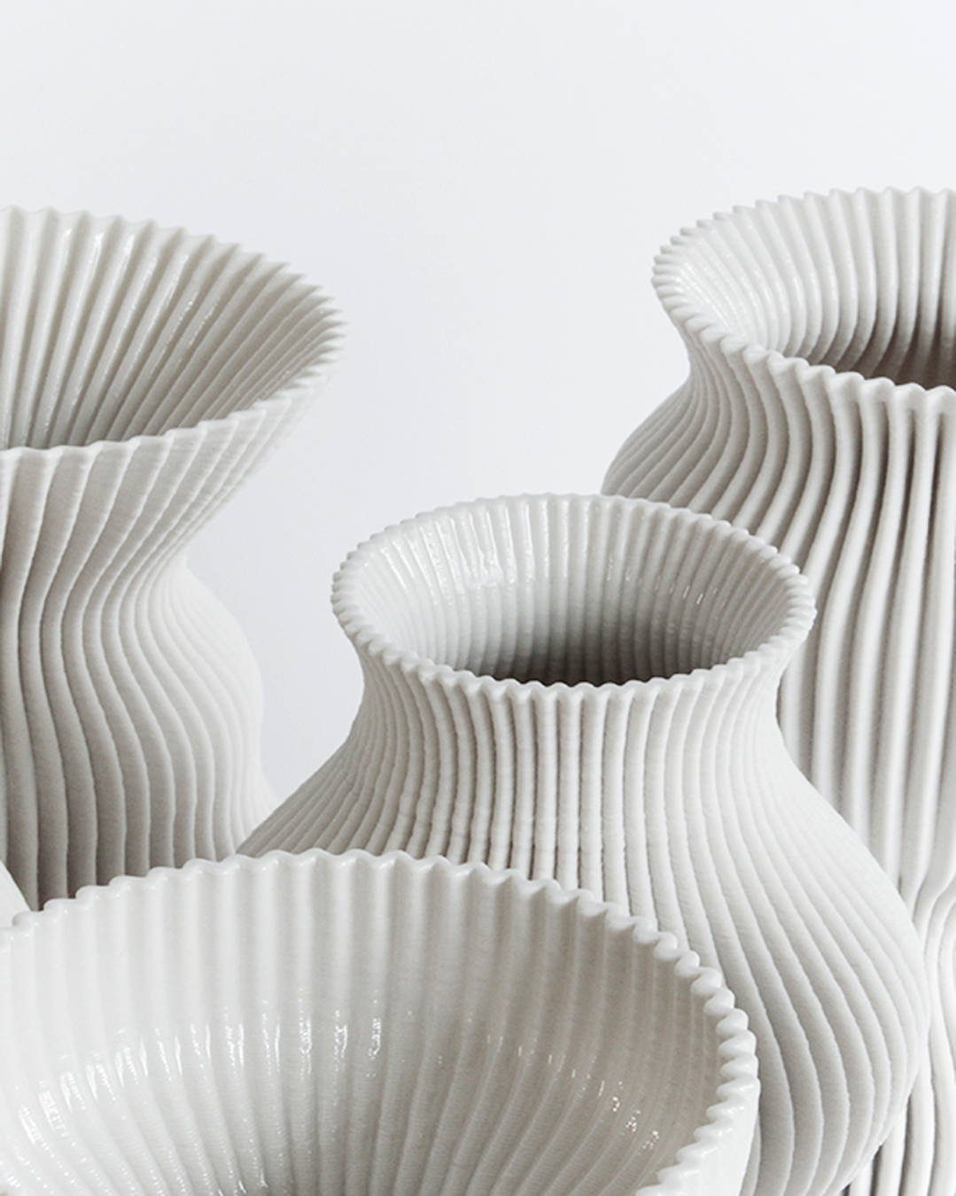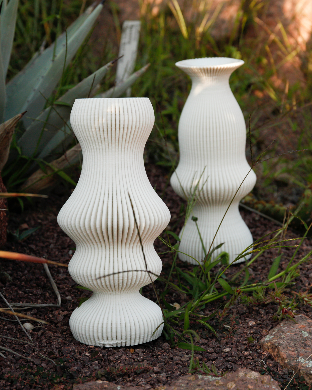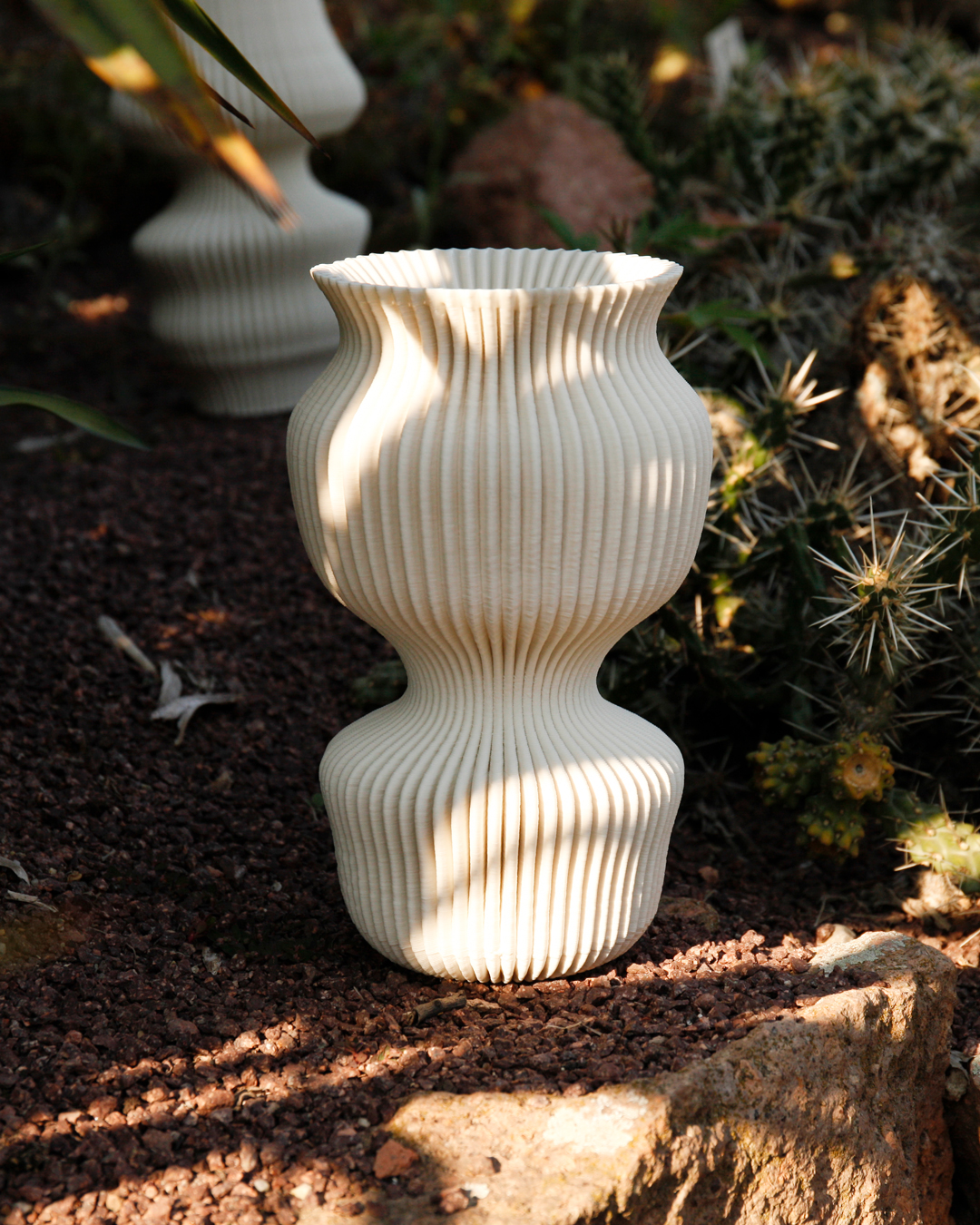 Stützstruktur – ein technischer Name, organische Formen, hergestellt im Keramik-3D-Druck. Dort ist das Drucken von Stützstrukturen problematisch, da diese im Nachhinein nicht ohne weiteres von dem Objekt zu lösen sind. Ohne Stützstruktur können gewisse Formen und Schrägen allerdings nicht gedruckt werden, da die Masse an kritischen Stellen instabil wird und einfallen würde. Ein digitales Werkzeug analysiert das Objekt auf mögliche Schwachstellen und fügt eine Struktur hinzu, welche an entsprechenden Stellen stabilisiert. Der Algorithmus macht „undruckbare“ Formen druckbar. Durch diesen funktionalen Ansatz entsteht eine ganz eigene Objektästhetik – ein funktionales Ornament und eine Serie, die ständig wächst, so wie die Kakteen im botanischen Garten.